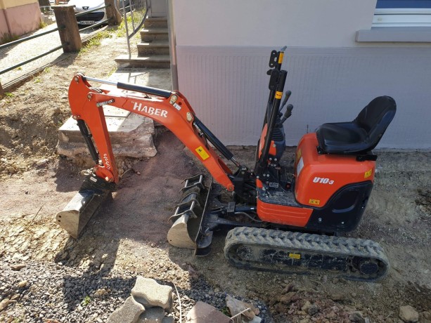 Location mini pelle Kubota U-10 (1T) équipée attache rapide et 3 godets.